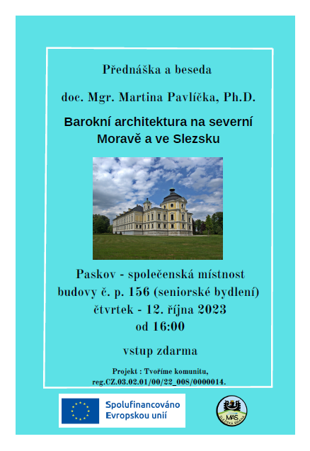 Ve čtvrtek 12. října. 2023 proběhla v rámci projektu Tvoříme komunitu přednáška nejen pro seniory na téma „Barokní architektura severní Moravy a Slezska“. Lektorem byl renomovaný kunsthistorik na toto téma doc. Mgr. Martin Pavlíček, Ph.D. Přednáška byla realizována na základě spolupráce seniorů a komunitního pracovníka pro seniory z MAS Slezská brána se Spolkem přátel paskovského zámku a s Městem Paskov ve společenské místnosti tzv. „seniorského bydlení“ (adresa ul. Nádražní 156, Paskov). Senioři o tuto akci projevili zájem především proto, že se s panem Pavlíčkem setkali při přednáškách na obdobné téma v tzv. Virtuální univerzitě třetího věku (je založena na projekci filmů) a přáli si setkat se s ním osobně. Téma bylo voleno po domluvě s lektorem tak, aby přenáška obohatila posluchače také nabídkou na možné návštěvy zajímavých míst v okolí Paskova, které by odpovídaly možnostem jednodenních výletů. Přednášky v podstatě „klubového charakteru“ se účastnilo 21 zájemců z Paskova a blízkého okolí (např. z Řepišť, Vratimova). Zájem o přednášku projevili v několika případech i zájemci z řad střední generace a akci je tak možno hodnotit jako mezigenerační. V závěru přednášky dal lektor prostor pro dotazy. Ten byl v několika případech využit a přednáška tak pokračovala formou besedy. Na závěr komunitní pracovník využil prostor pro diskusi se seniory a seznámil je s podrobnostmi další připravované aktivity – přednášky na téma „Zábor pohraničí a uprchlická vlna v Paskově a okolí v letech 1938 -1939“. Zájem o tuto akci byl vyvolán jak zkušenostmi s přednáškami lektorky – historičky Muzea Těšínska Mgr. Lenky Novákové, Ph.D., tak aktuálním společenským děním i výročím 85 let od podpisu tzv. Mnichovské dohody v r. 1938, která předznamenávala blížící se světový válečný konflikt. Přednáška proběhne opět ve společenské místnosti „seniorského bydlení“ v Paskově. Akce je plánovaná na 9. listopadu 2023. |